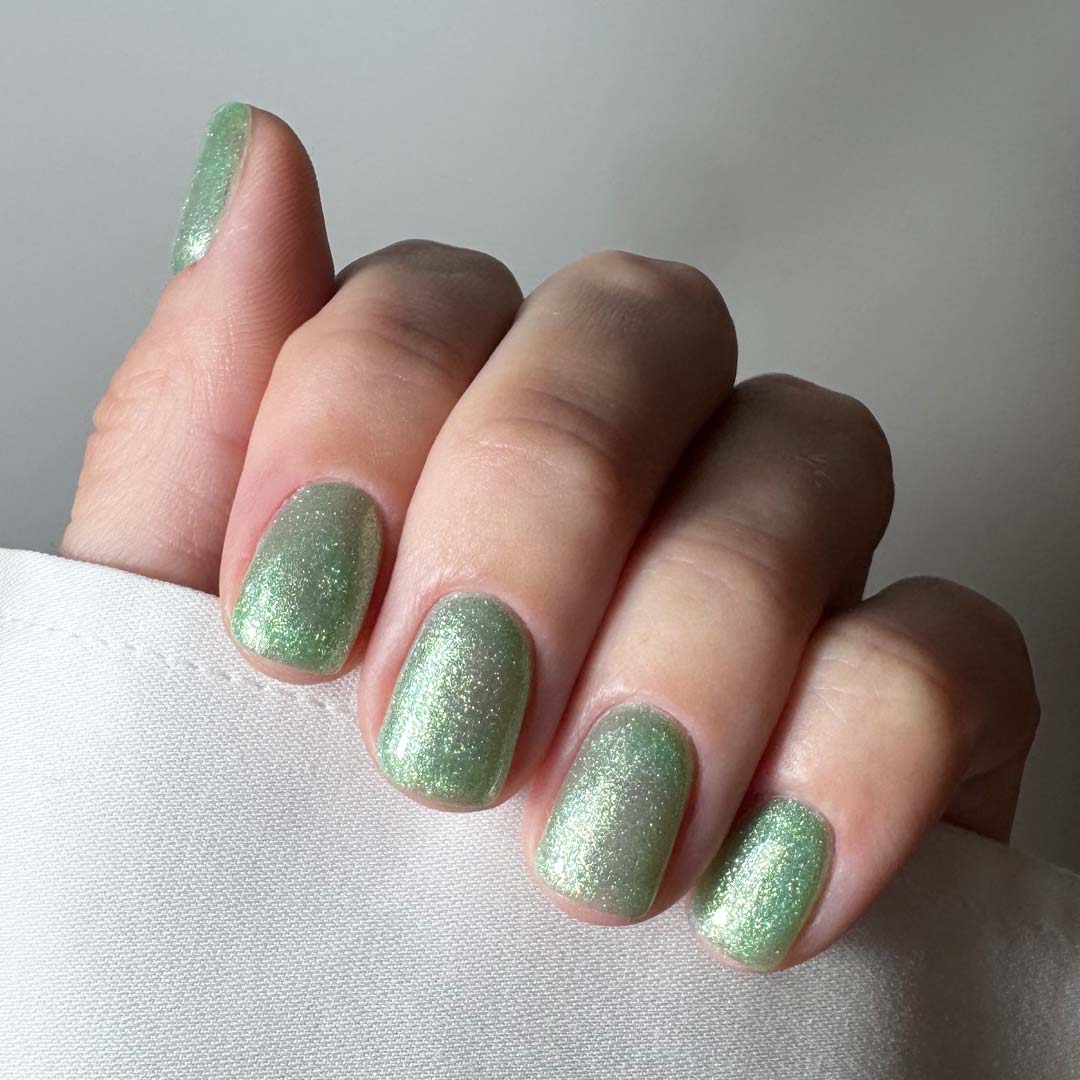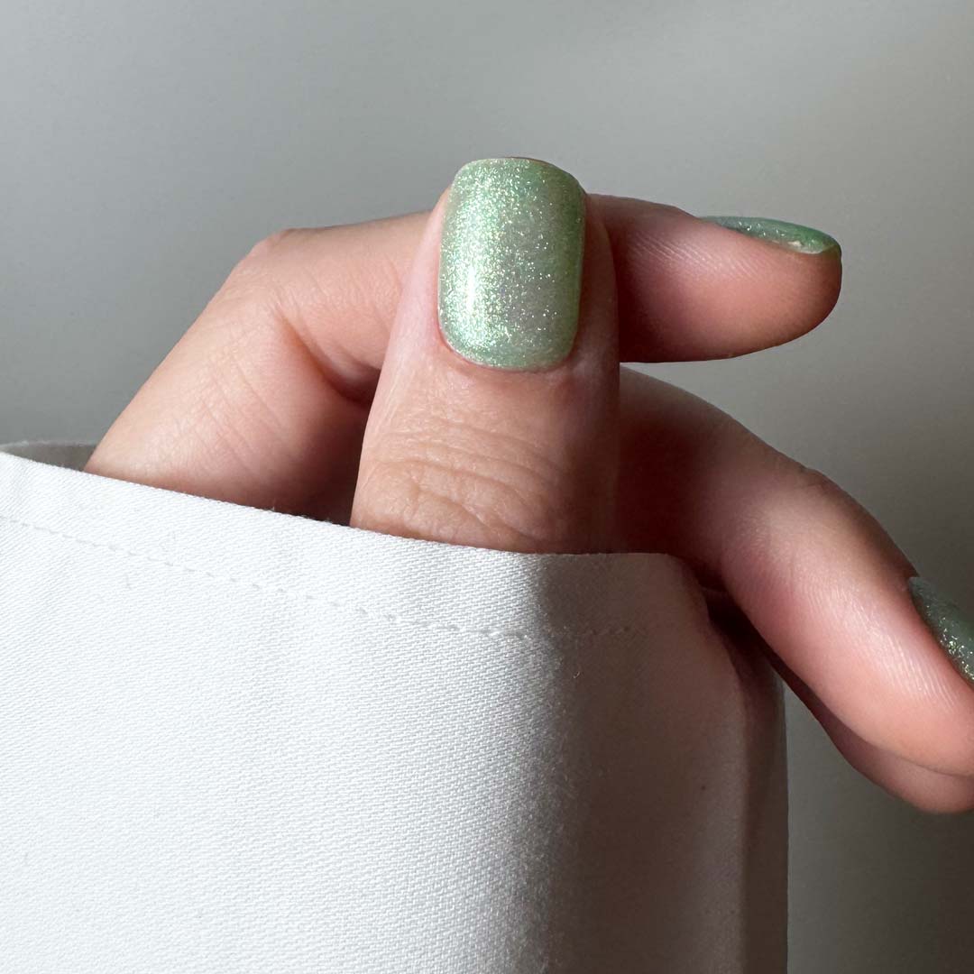 Fresh, luminous, and effortlessly cool — Skinny Dip is a soft mint-green shimmer that captures the feeling of sunlight on skin and sea glass tones beneath the surface. Its sheer, buildable base and fine reflective sparkle make it beautifully versatile — wear it as a delicate wash of colour or layer for a bolder, light-catching finish.